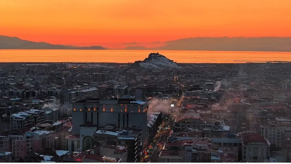 Doğası ve tarihi dokusuyla her mevsim ziyaretçilerini kendine hayran bırakan Van, akşam saatlerindeki gün batımı manzarasıyla kartpostallık görüntüler sundu. Dünyanın en büyük sodalı gölü olan Van Gölü’nün berrak suları üzerinde gün batımı renk skalasıyla seyri doyumsuz manzaralar oluşturdu.