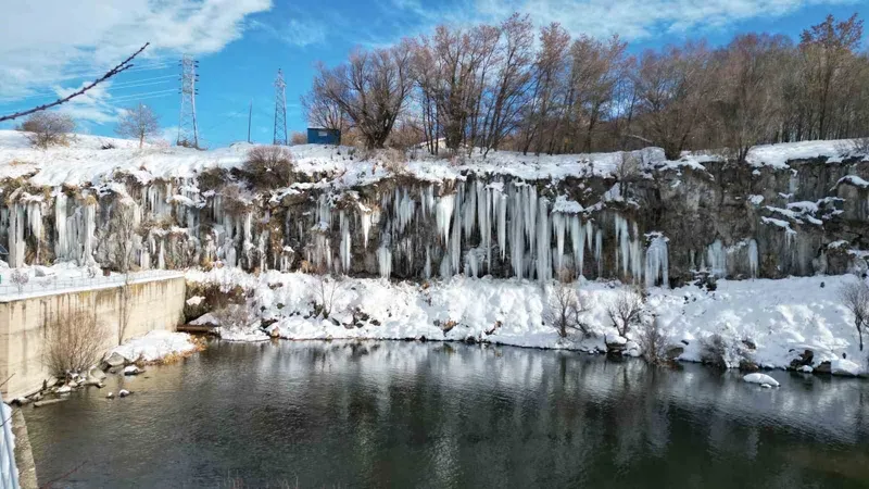 Van’ın Erciş ilçesindeki Koçköprü Kanyonu’nda oluşan metrelerce boydaki buz sarkıtları görsel şölen sunuyor.