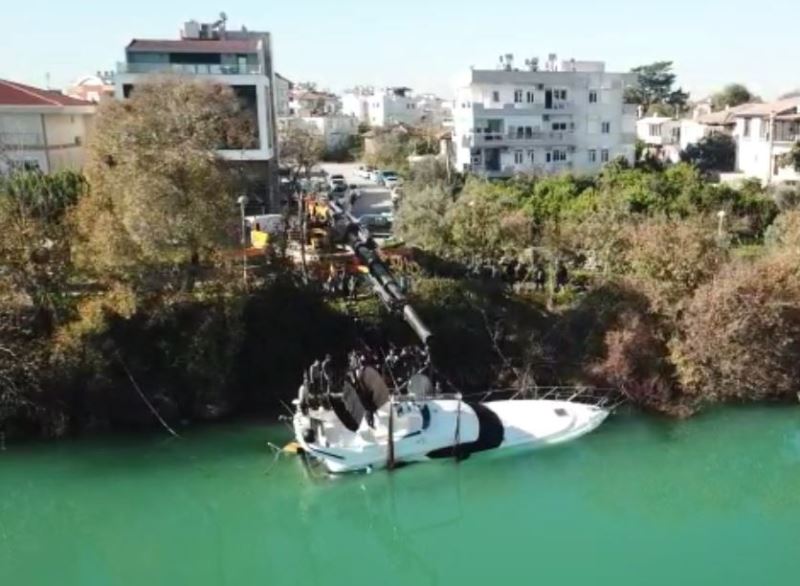 Antalya’nın Manavgat ilçesinde Manavgat Irmağı’nda iskelede bağlı durumdaki 15 metrelik lüks yat, içerisine su alması nedeniyle batma tehlikesi atlattı. Vinç yardımı ile önce havaya kaldırılarak suyu boşaltılan tekne, ardından tersaneye çekildi.