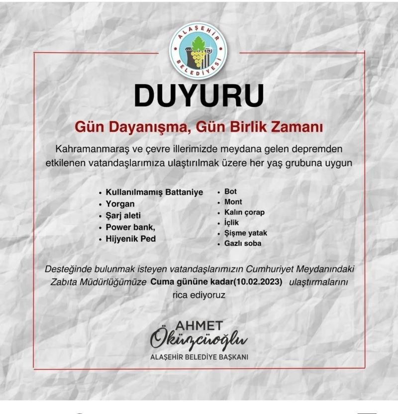 Alaşehir Belediyesi tarafından yaşanan büyük depremin ardından yardım kampanyası başlatıldı. Kampanyayla ilgili olarak belediye tarafından vatandaşlara kısa mesaj ve şehir içi hoparlörleri ile çağrıda bulunuldu. Yardım etmek isteyen vatandaşlar istenen malzemeleri Alaşehir Belediyesi Zabıta Müdürlüğüne teslim edebilecekler. Alaşehir Belediye Başkanı Ahmet Öküzcüoğlu, "Bu sabaha karşı meydana gelen Kahramanmaraş ve depremden etkilenen çevre illerimizde yaşayan vatandaşlarımıza ulaştırılmak üzere her yaş grubuna uygun kullanılmamış kışlık giysi, battaniye, tüplü soba, uyku tulumu, paketli hazır gıda, su, süt, bebek ihtiyaç ve hijyen malzemesi, çadır, ışıldak gibi ihtiyaçları Alaşehir Belediyesi Zabıta Müdürlüğüne 10.02.2023 Cuma günü mesai bitimine kadar ulaştırabilirler. Toplanan yardım malzemelerini en kısa sürede depremzede vatandaşlarımıza ulaştıracağız." dedi.