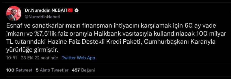 Bakan Nebati, sosyal medya hesabından esnaf ve sanatkarların finansman ihtiyacını karşılamak için 60 ay vade imkanı ve yüzde 7,5’lik faiz oranıyla kullandırılacak 100 milyar TL tutarındaki Hazine Faiz Destekli Kredi Paketi’nin Cumhurbaşkanı Kararı’yla yürürlüğe girdiğini açıkladı. Bakan Nebati paylaşımında şu ifadelere yer verdi: