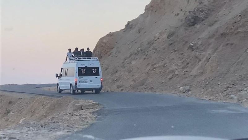 Batman’ın Kozluk ilçesinde düğünden dönen minibüsün üzerine çıkan 6 kişi canlarını hiçe sayarak 10 kilometre boyunca yolculuk yaptı.