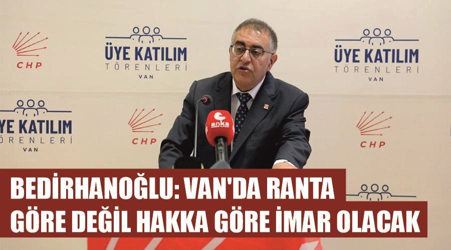 Van'ın imar planında mutlak anlamda revizyon yapılması gerektiğini aktaran Bedirhanoğlu, CHP iktidarında Van'ın kronik sorunlarına samimiyetle eğileceklerini söyledi. Bedirhanoğlu, sözlerine şöyle devam etti: "İktidarın yanlış politikalarının cezasını maalesef vatandaş çekiyor. Bu kul hakkıdır. Bunu çözmek zorundayız. Van'da birçok ilde olmayan bir trafik sorunu var. Bakın bir çevre yolu hikayesi var yıllardır devam ediyor. Birçok yerde kamulaştırma yapılırken Van'da 18. maddeyi ısrarla uygulamaya çalışıyorlar. Bu da şehri kilitliyor. Son 2 yılda 50 bin kişi bu güzelim şehirden göç etmiş bu kabul edilebilir değil. Van'ı cezalandıran zihniyete dur diyeceğiz. Bakın kayyumlar eliyle, iktidar eliyle imar planlarında bir standart uygulanmadı. Her zaman söylüyoruz. Van'ın en önemli sorunlarından biri de imar mevzusudur. İktidarımız döneminde ranta göre değil hakka göre imar olacak. Denize yakın yerlerde bakıyorsunuz 7-8 katlı yapılar var. Ama Erek dağına yakın bölgeler, yer yapısı daha sağlam olan bölgelerde 3-4 katlı yapılar var. Yani iktidarın, kayyum belediyelerinin yaptığı bu ranta göre imarı Van'ın yüksek bir binasına çıkıp şehre bakarsanız görürsünüz."