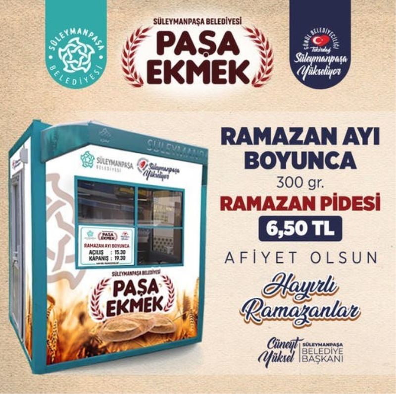 Birçok mahallede konuşlandırılan Paşa Halk Ekmek büfeleri, Süleymanpaşa Belediyesi ve ilçede faaliyet gösteren çok sayıda ekmek fırınının iş birliği ile bir yıldan uzun süredir ihtiyaç sahibi vatandaşlara uygun fiyatlı ekmek ulaştırıyor. Ramazan ayının gelmesi ile birlikte Ramazan geleneklerinden biri olan pide satışı da Paşa Halk Ekmek büfelerinde yerini aldı.