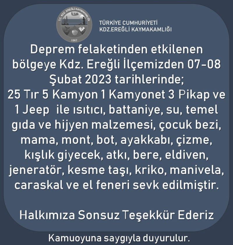 Kdz. Ereğli kaymakamlığı bünyesinde yapılan yardım kampanyaları deprem bölgelerine ulaştırılmak üzere yola çıktı.