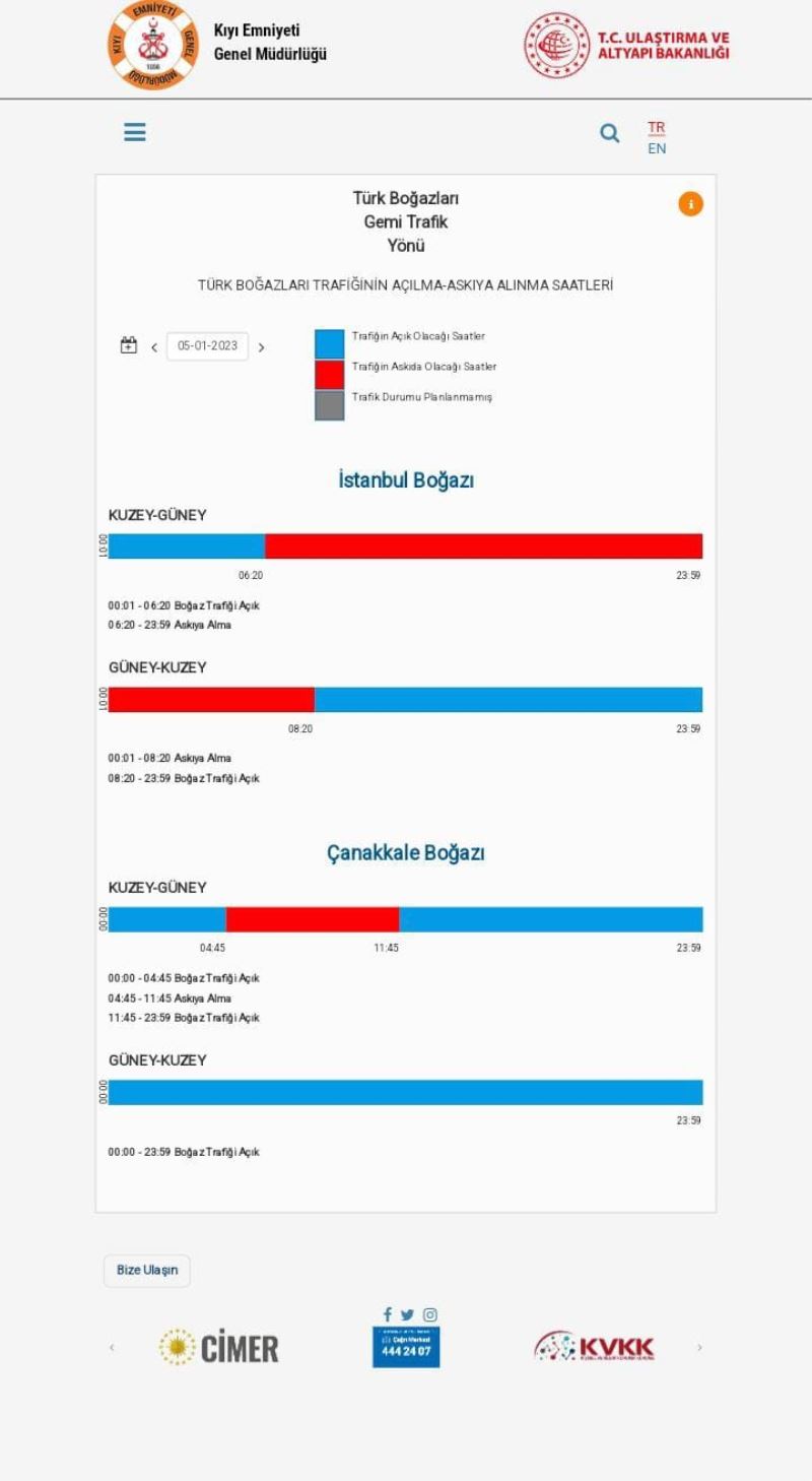 İstanbul Boğazı çift yönlü olarak gemi trafiğine kapatıldı. Kıyı Emniyeti Genel Müdürlüğünün internet sitesinden yapılan açıklamada, saat 06.20 itibarıyla İstanbul Boğazı’nın çift yönlü olarak gemi geçişlerine kapatıldığı belirtildi.
