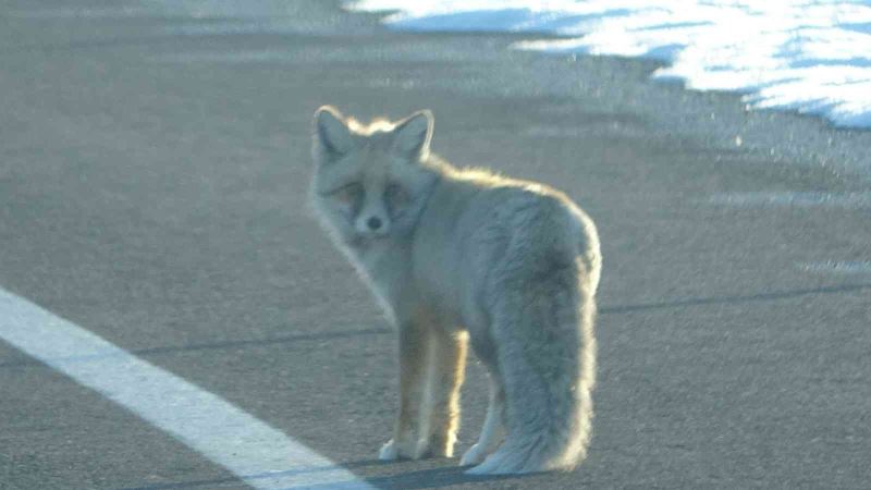 Karla beyaza bürünen Ardahan’da yiyecek bulmak için kara yoluna inen tilki, kameralara yansıdı.