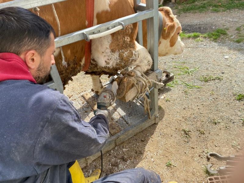 Tırnak bakımının büyükbaş hayvanlar açısından önemli olduğunu ifade eden veteriner teknisyeni Fikret Biçer, "Tırnak bakımının hayvanlarda, özellikle büyükbaşlarda sıkıntı oluşturduğu dönemler oluyor. Tırnak sıkıntısı olduğunda hayvan artık yürüyemiyor, süt ve döl verimi düşüyor hatta veremiyor. Veteriner hekim gözetiminde tırnak bakımı yapıyoruz. Köylere hizmet veriyoruz. Vatandaş, kış boyunca içeride olduğu için büyükbaş hayvanının bakımını genelde bu mevsimde yaptırıyor. Bu nedenle bizler de bu dönemlerde yoğun oluyoruz" dedi.