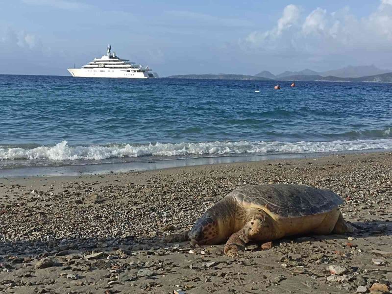 Muğla’nın Bodrum ilçesinde nesli tükenmekte olan caretta caretta cinsi kaplumbağa, fırtınanın etkisiyle ölü halde sahile vurdu.