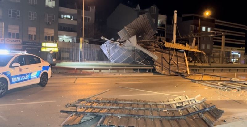 Bursa’da öğle saatlerinde etkisini gösteren şiddetli lodos gece saatlerinde de hız kesmedi. 3 katlı bir binanın çatısı ise fırtınanın etkisiyle uçup metro güzergahı ve anayola düştü.