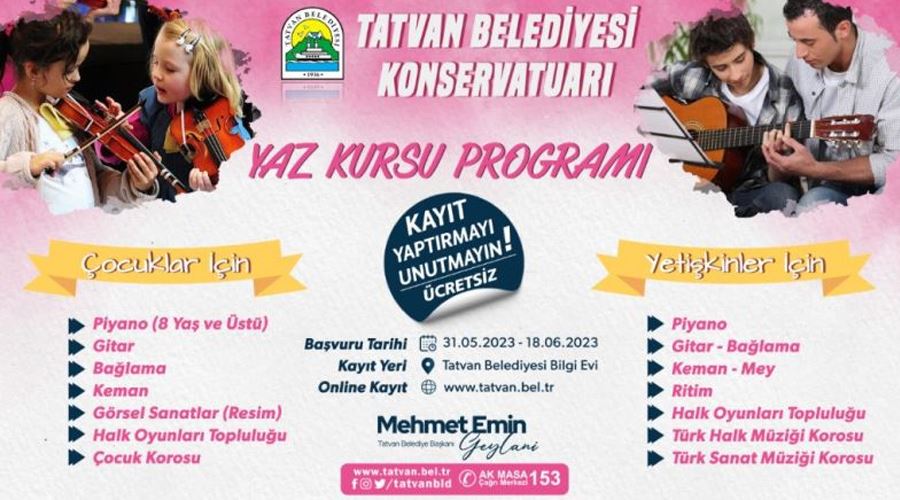 Tatvan Belediyesi tarafından yapılan konservatuar merkezi, öğrencilere hizmet vermeye başlıyor. İşletme Mahallesi’nde bulunan Tatvan Belediyesi Konservatuar Merkezi’nde çocuklar için piyano, gitar, keman, görsel sanatlar (resim), halk oyunları topluluğu ve çocuk korosu kursları verileceği belirtildi. Yetişkinlerde ise piyano, gitar, keman, mey, ritim, halk oyunları topluluğu, Türk halk müziği korosu ve Türk sanat müziği korosu kurslarının yer alacağı kurslara başvuru için son tarihin 18 Haziran 2023 Pazar günü olduğu bildirildi.