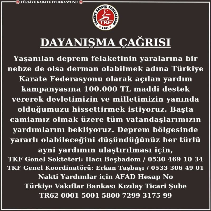 Türkiye Karate Federasyonu (TKF), merkez üssü Kahramanmaraş ve çevre illerde depremden etkilenen depremzedeler için 100 bin TL nakdi yardım desteği vereceğini açıkladı.
