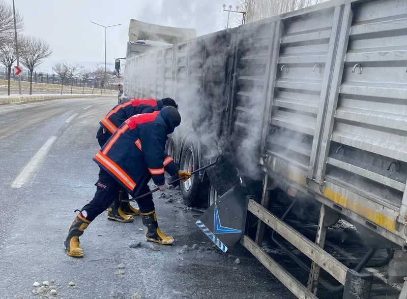 Van’ın Edremit ilçesinde seyir halindeki tırın yanan lastikleri itfaiye ekipleri tarafından söndürüldü.