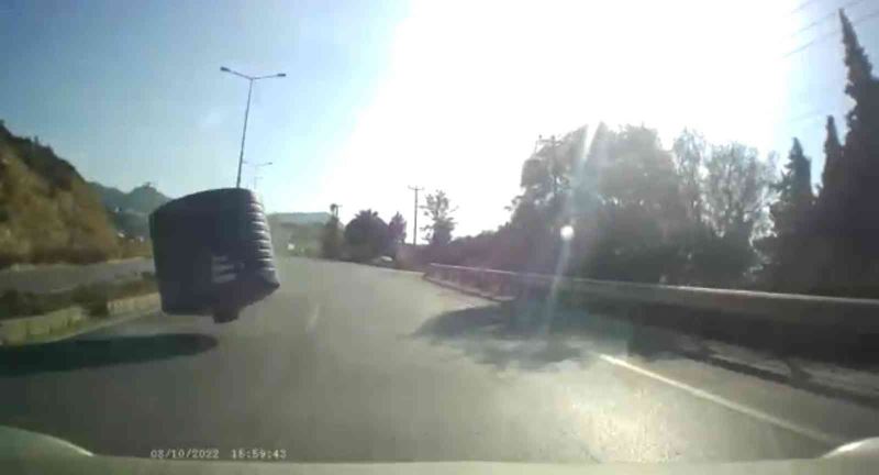 Muğla’nın Bodrum ilçesinden kamyonetin arkasında bulunan 10 tonluk su tankı virajda düşerek karşı şeritte geçti. Seyir halinde olan otomobilin üzerine zıplaya zıplaya gelen su tankını gören araç sürücüsü son anda yaptığı manevrayla ölümden döndü. O anlar araç kamerasına yansıdı.